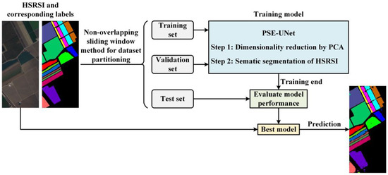 With the development of deep learning, the use of convolutional neural networks (CNN) to improve the land cover classification accuracy of hyperspectral remote sensing images (HSRSI) has become a research hotspot. In HSRSI semantics segmentation, the traditional dataset partition method may cause information leakage, which poses challenges for a fair comparison between models. The performance of the model based on “convolutional-pooling-fully connected” structure is limited by small sample sizes and high dimensions of HSRSI. Moreover, most current studies did not involve how to choose the number of principal components with the application of the principal component analysis (PCA) to reduce dimensionality. To overcome the above challenges, firstly, the non-overlapping sliding window strategy combined with the judgment mechanism is introduced, used to split the hyperspectral dataset. Then, a PSE-UNet model for HSRSI semantic segmentation is designed by combining PCA, the attention mechanism, and UNet, and the factors affecting the performance of PSE-UNet are analyzed. Finally, the cumulative variance contribution rate (CVCR) is introduced as a dimensionality reduction metric of PCA to study the Hughes phenomenon. The experimental results with the Salinas dataset show that the PSE-UNet is superior to other semantic segmentation algorithms and the results can provide a reference for HSRSI semantic segmentation.