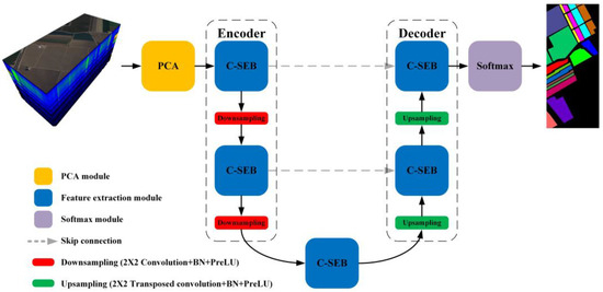 The PCA is used for dimensionality reduction of the HSRSI before they are input into the encoder, and the CVCR is selected as the dimensionality reduction standard to analyze the impact of different CVCRs on the segmentation accuracy. The encoder consists of two C-SE modules and two downsampling units. The decoder consists of two C-SE modules and two upsampling units. The skip connections are used to combine the shallow and deep features to avoid the loss of spatial information caused by downsampling. After all convolution operations in the model occur, the batch normalization (BN) [45] module is connected and the parametric rectified linear unit (PReLU) [46] is used as the activation function. Finally, Softmax is used for pixel-wise classification, and the output of Softmax is the final segmentation results of land cover classes in the network.