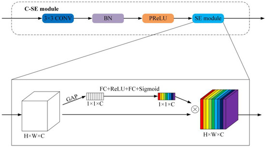 The C-SE module consists of convolutions, BN, PReLU, and an SE (Squeeze and Excitation) module [47], as shown in Figure 4. Since the HSRSI is multi-dimensional, an SE module, a lightweight channel attention mechanism, is introduced after the convolution module in the C-SE module to learn the interdependence between the feature channels through the “Squeeze-and-Excitation” structure. During the squeeze, the global average pooling (GAP) layer is used to compress the input 2D feature map into 1D real numbers, and in the excitation, two fully connected layers and a rectified linear unit (ReLU) [48] are used to build a model to fit the nonlinear relationship between the feature channels. Finally, the channel weight normalized by the sigmoid function is multiplied by the input feature map to enhance the related features and suppress the unrelated features. Hence, the C-SE module can extract more discriminative semantic features and obtain better segmentation results.