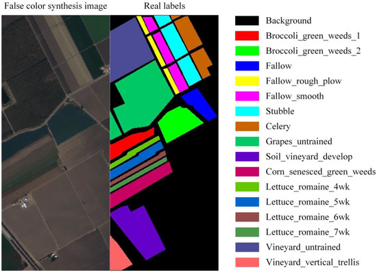 In this paper, the Salinas public dataset published on the National Aeronautics and Space Administration (NASA) website is used. The Salinas dataset is commonly used in the classification of HSRSI. The dataset is photographed by an Airborne Visible/Infrared Imaging Spectrometer (AVIRIS), with a total of 224 continuous spectral bands, excluding 20 bands absorbed by water. The wavelength range is from 400 nm to 2500 nm, the spatial resolution is 3.7 m, and the image size is 512 × 217. Sixteen land cover classes have been labeled in the Salinas dataset. Together with the background that has not been labeled, 17 classes have been labelled in total, as shown in Figure 5. The Salinas dataset is partitioned by the dataset partition method in this paper, and a total of 112 patches of 32 × 32 are obtained. During the experiment, 66 patches were used for training, 23 were used for validation, and the remaining 23 were used for testing. The sample size of each class in each set is listed in Table 1.