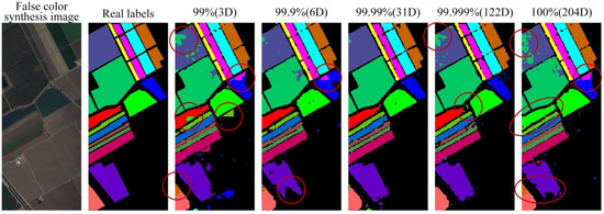 Figure 6 shows the visualized segmentation results with different CVCRs. It can be seen that in the segmentation map with a CVCR of 99%, the objects that have similar features, including Broccoli_green_weeds_1 and Broccoli_green_weeds_2, Fallow and Fallow_smooth, Grapes_untrained, and Vineyard_untrained, are seriously misclassified (marked with red circles in Figure 6); when the CVCR increases to 99.9% and 99.99%, the misclassification phenomenon decreases. However, when the CVCR reaches 99.999%, the obvious misclassification of Grapes_untrained and Vineyard_untrained appears again. The segmentation results without dimensionality reduction also show that the objects with similar features are misclassified (red circles shown in Figure 6). In general, misclassification mainly occurs among the classes with similar features. With the increase of dimension, misclassification shows a trend of first decreasing and then increasing.