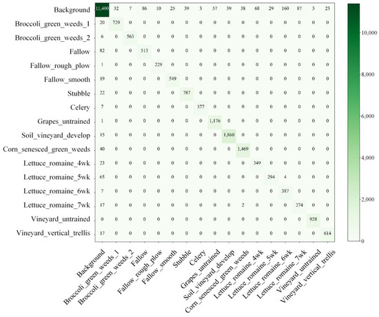 In addition, the confusion matrix in Figure 7 shows that the algorithm proposed in this paper has good segmentation performance for most categories and less misclassification between different classes. For some patches affected by the interaction between the background and land features, there is relatively more misclassification, and the classification accuracy is slightly reduced. For example, the features of Fallow are similar to the features not labeled in the background, and the contour of Lettuce_romaine is a long strip and there are small sample sizes. Therefore, there is relatively more misclassification between these two classes and the background.