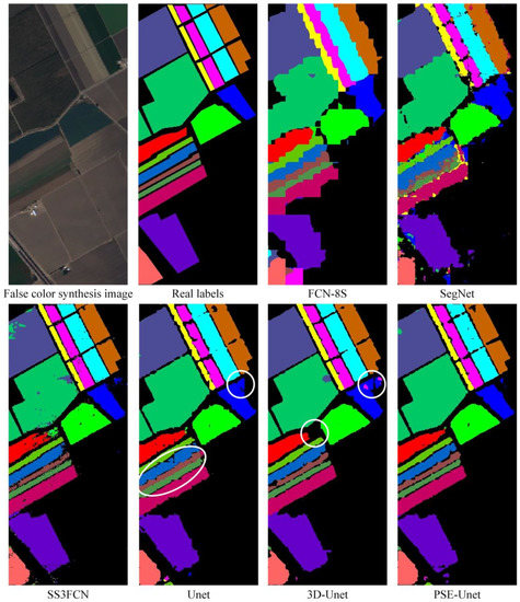 Taking the Salinas dataset as the basic data source, the PSE-UNet network proposed in this paper is compared with the FCN-8S [10], SegNet [11], UNet [12], 3D-UNet [38], and SS3FCN [35]. Among them, FCN-8S, SegNet, and UNet are three classical semantic segmentation networks, 3D-UNet performs well in semantic segmentation of medical hyperspectral images, and SS3FCN is an advanced method for HSRSI sematic segmentation. In order to ensure the objectivity of the experimental results of different models, the training adopted the same network parameter setting, the input data were patches of 32 × 32, and the CVCR was set to 99.99% (31D) for dimensionality reduction with PCA. Each model was tested five times independently, and the final results were the average of the five experimental results. The above-described five evaluation metrics were used to evaluate the accuracy of the experimental results. As shown in Table 3, compared with those of the other four segmentation models, the five metrics of the model proposed in this paper show the best accuracy, and the Kappa coefficient, WAP, WAR, WAF, and mIoU are 93.359%, 95.348%, 95.218%, 95.238%, and 88.508%, respectively. Compared with the suboptimal 3D-UNet algorithm, the Kappa coefficient, WAP, WAR, WAF, and mIoU of the new algorithm in this paper are increased by 1.943%, 1.352%, 1.402%, 1.434%, and 2.846%, respectively. In addition, in the networks of UNet, 3D-UNet, and PSE-UNet that also use the structure of “encoder-decoder”, the number of parameters of the 3D-UNet network using 3D convolution is three times that of the UNet network, while the number of parameters of the network in this paper is only 4.5 M, less than two-thirds of that of the UNet network. Among the six algorithms, the algorithm proposed in this paper has achieved the best accuracy and outstanding segmentation performance.