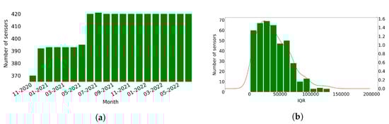 Number of sensors that produce traffic data per day and distribution of the IQR of the number of vehicles measured by each sensor. (a) Number of sensors that produce traffic data each month. (b) Distribution of the IQR of the vehicles measured by each sensor.