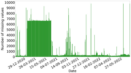 Considering all the sensor measurements in the time frame between 5 November 2020 and 30 June 2022 and the time interval each of the 420 sensors was producing data, the number of the total potential observations would be 5,295,504. However, 1,067,483 observations (or 20.16%) are missing. Figure 2 presents the number of missing observations per day. The number of missing observations are increased until the end of May 2021. However, from June 2021, there is a significant decrease in the number of observations that are missing. Finally, the number of missing observations starts to eliminate after January 2022 and, specifically, after 2 January 2022. We select the time period from 2 January 2022 to 23 June 2022 as the “best” time period. This time period includes 75,425 missing observations.