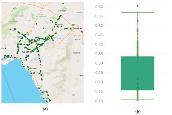We also calculate the percent of missing observations for each sensor from 5 November 2020 to 30 June 2022. Figure 3 presents the street map with the 420 sensors and also the boxplot, which presents the distribution of the missing observations per sensor. The sensors are positioned on 93 main roads in the region of Attica. In Figure 3a, a mark is displayed over each sensor’s longitude and latitude in the region of Attica. The colors of the marks indicate the percent of missing observations of the sensor; red color marks represent sensors with higher percentages of missing observations, green marks sensors with lower percentages of missing observations, and yellow marks sensors with intermediate percentages of missing observations. In addition, the boxplot in Figure 3b presents the distribution of the number of missing observations per sensor. The median percent of missing observations is 33.1%, meaning that half of the sensors have less than or equal percentages of missing observations to the median, and half of the sensors have greater than or equal percentages of missing observations to it. In total, 50% of the sensors have a percentage of missing observations in the range of 15.5–33.43% (interquartile range box). In addition, according to the whiskers of the boxplot (bottom 25% and top 25% of the data values, excluding outliers), the percent of missing observations of each sensor may be as low as 10.3% and as high as 56.8%. In addition, based on our calculations, only eight sensors have less than 10% missing observations. Finally, only one sensor has a percentage of missing observations above 60%.