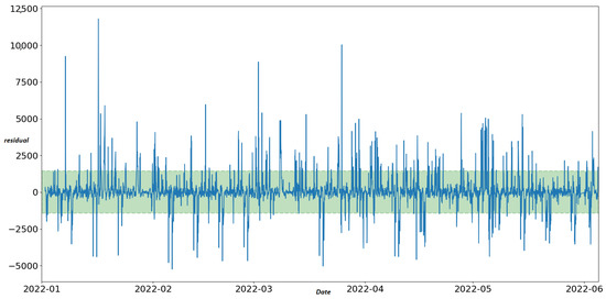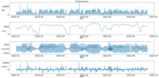 The STL decomposition is applied to aggregated traffic data for the corresponding time window between 2 January 2022 and 23 June 2022 (4152 h). STL detects 4720 anomalies related to the nine “best” sensors (12.6% of 37,368 total records) of Table 3. Figure 4 shows an example of STL decomposition related to the observations of one sensor (sensor “MS734”) for the selected time window. For anomaly detection, we examine the last curve of the STL method, the residual curve. Therefore, we apply the IQR method in the residual curve to specify the upper and lower fence for outlier detection. Observations above the upper limit and below the lower limit are considered anomalies. Finally, we set the scalar multiplied with IQR to three after a set of experiments. The upper and lower limits of the residual curve are defined using the following formula: