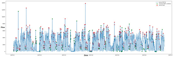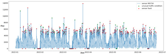 Time series of sensor “MS734” with anomalies detected by STL decomposition. Red dots are anomalies classified as “sensor faults”, and green dots are anomalies classified as “unusual traffic conditions”.