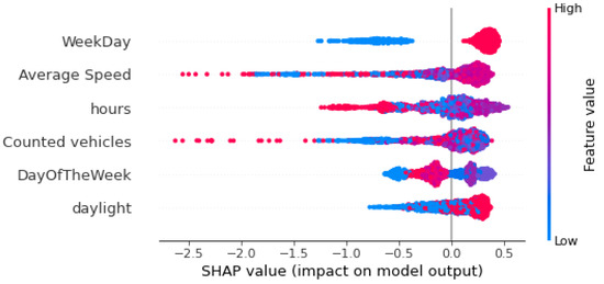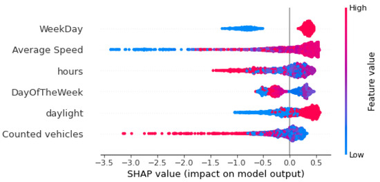 In order to further explore the quality of the OGD traffic dataset, we train the isolation Forest (iForest) algorithm on additional features and make explanations using the SHapley Additive exPlanation (SHAP) framework to interpret the classification of anomalies. Our goal is to explore specific patterns among the traffic dataset that may lead to anomalies and, hence, deteriorate its quality. In this direction, the following explanations do not interpret the exact reasons in anomalies but rather give an estimation of what the indicators are that might contribute to a traffic anomaly. The iForest algorithm is suitable for high-dimensional anomaly detection involving multiple features during the partitioning process. The main difference from the one-feature implementation is that the algorithm randomly selects a feature every time it partitions a data point. Then the model selects a split value between the minimum and maximum values of the selected feature. For that reason, we calculated four temporal features from our time series: (i) the weekday, a binary variable showing whether the observation is recorded on a weekday (value 1) or weekend (value 0), (ii) daylight, a binary variable to show whether the measurement was made in the day (value 1) or night (value 0), (iii) the day of the week of the measurement, a number in the range 0–6 (0 = Monday and 6 = Sunday), and (iv) the hour of the day of the measurement, a number in the range 0–23. Finally, we also add the average speed of vehicles measured by the traffic sensors for one hour.