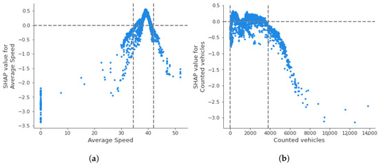 In order to fully understand the relationship between a feature’s values and the model’s outcomes and estimate the influence of variables on anomaly detection, we also create SHAP dependence plots. A dependence plot depicts every data instance (i.e., every row) as a blue dot. These dots form a scatter plot of the feature’s raw values versus the corresponding SHAP values. Figure 10 illustrates dependence plots for the two measured variables of the traffic sensors: average speed and counted vehicles for sensor MS734. SHAP values above the y = 0 line lead to the detection of normal points, whereas those below it are considered anomalies. For instance, the pattern of the Figure 10a plot indicates that sensor measurements with zero average speed are considered anomalies. Furthermore, there is a range of average speed between 33 and 42 km/h, where the corresponding SHAP values are positive, indicating that sensor measurements between this range are more likely considered normal. Figure 10b shows the number of counted vehicles measured by sensor MS734 and their corresponding SHAP values. For this sensor, measurements with more than 3800 vehicles per hour have a significant decrease in SHAP values, clearly indicating anomalous traffic behavior. Moreover, recordings with counted vehicles between zero and 3800 vehicles per hour can be both normal and anomalous.