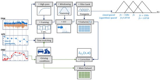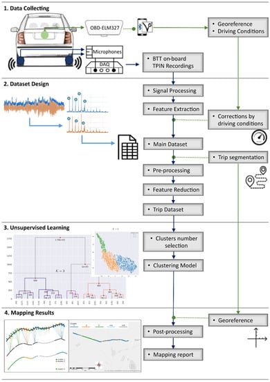 Firstly, the data are collected from three different types of input, such as the recordings of the TPIN signal, speed, and acceleration from the vehicle’s electronic control unit via the On-Board Diagnostics (OBD) port, and coordinates of the surveyed routes from a smartphone GPS. Afterwards, the dataset construction is performed through sound signal processing by frequency domain transformations, feature extraction, and driving condition dependences. The conformed dataset can be sliced by geographic areas or specific streets to deepen distress road identification.