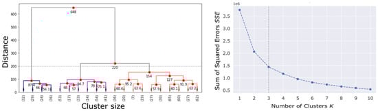 The approximation of the minimum number of clusters could be established by the “elbow diagram”. The elbow method helps to determine the optimal number of clusters by means of the sum of squared errors or inertia function minimization []. The inflexion point “elbow” of the vs. plot shows the optimal number of clusters.