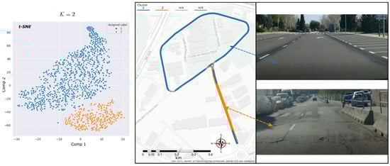 The first experiment was carried out in the Reference-route. The benefit of applying the proposed methodology on this route is to evaluate the clustering performance on a controlled and known road environment. The road has two different types of superficial conditions (Figure 5) which includes the last renewed pavement (6 months before the data acquisition) conforming the main ring-shaped route, and the straight access to the ring where the distress sections are presented, such as longitudinal, transversal and alligator cracking.