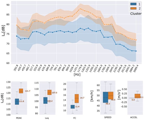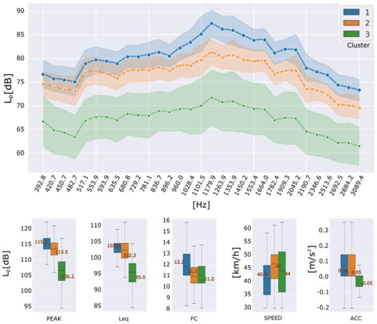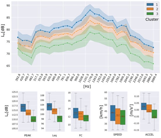 Reference-route data clustering results. Features and driving conditions by formed clusters: Frequency domain (up); Peak level, Equivalent continuous sound level, Crest Factor, Speed and Acceleration (down).