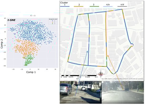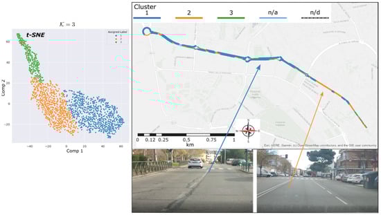 Reference-route data clustering results. t-SNE clusters formed (left). Geopositioned clusters (middle-right).