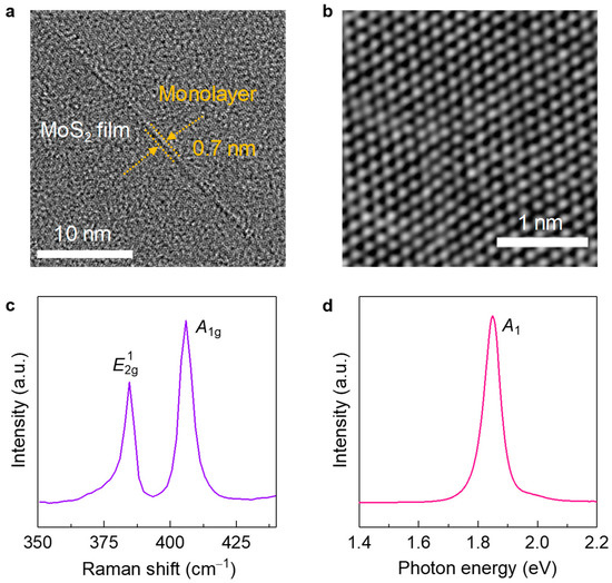 Figure 1a shows TEM images of MoS2 film synthesized via CVD. Overall, the obtained film shows good uniformity with no remarkable voids or cracks. (Figure 1a and Figure S1). In addition, the folded area indicates that the number of layers is monolayer. High-resolution scanning transmission electron microscopy (STEM) confirms a three-fold coordinated atomic arrangement [17], indicating that our MoS2 films correspond to a monolayer structure and are well grown via CVD (Figure 1b). Figure 1c,d show Raman and PL spectra of the obtained MoS2 films. In the Raman spectrum, there are two prominent peaks indicating and A1g, involved in in- and out-of-plane modes [18,19], respectively (Figure 1c). From the Raman spectrum, we then calculated the peak difference (A1g − ) and full-width at half-maximum (FWHM) of , which indicate the number of layers and film uniformity, respectively [18,19]. The estimated peak difference and FWHM of are 20.8 and 4.6 cm−1, respectively. These results further confirm that our MoS2 is a monolayer and that the film quality is comparable to that of a mechanically exfoliated flake [18,19]. In PL spectrum (Figure 1d), a distinctive peak at 1.81 eV corresponding to the A1 exciton can be seen. This observation further supports that our MoS2 film is a monolayer [19], which is consistent with the TEM images and Raman spectrum (Figure 1a–c).