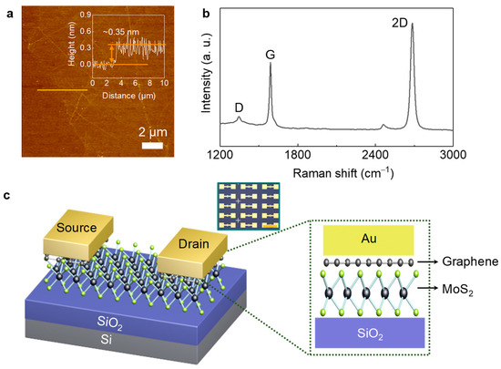 We first synthesized MoS2 film via CVD using precursor powders, including MoO3 (99.999%, Advanced Chemicals, Altona, Australia) and sulfur (99.9% Sigma Aldrich, St. Louis, MO, USA). Each precursor was placed into two ceramic crucibles. A MoO3 crucible was placed at the center of a 1 inch quartz tube, and a sulfur crucible was positioned upstream of the MoO3 crucible. A Si/SiO2 substrate was loaded downstream of the MoO3 crucible. Then, the furnace was heated to 650 °C and maintained at this temperature for 40 min with a flow of Ar (50 sccm) under 0.3 Torr. After finishing the reaction, natural cooling was performed with 200 sccm of Ar flow. Graphene monolayer film was also synthesized on Cu foil (Alfa Aesar, Haverhill, MA, USA) via identical CVD. The specific synthetic process is explained in our previous report [13].