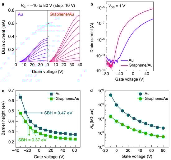 (a) Output and (b) transfer characterizations of MoS2 devices with Au and graphene/Au contacts. (c) Barrier height and (d) contact resistance (Rc) of MoS2 devices with Au and graphene/Au contacts as a function of gate voltages.