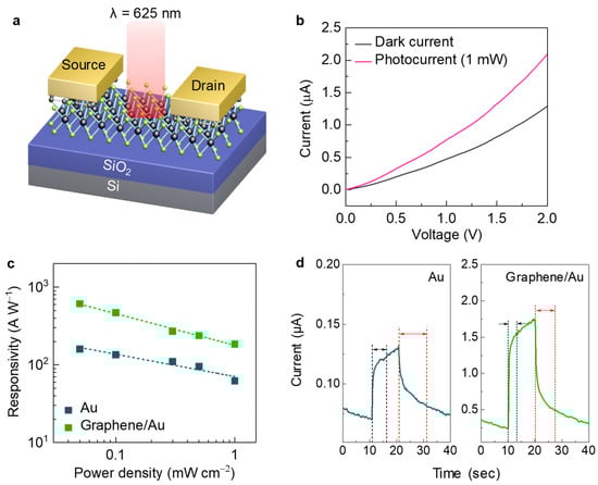 We finally assessed the photoelectrical properties of MoS2 devices under illumination at 640 nm (Figure 4a,b). Under illuminations, the photocurrent occurs in our devices, meaning that photogenerated carriers are created under light illumination conditions. To evaluate the photoelectric performance of our devices, we calculated the light-power dependent responsivity (R), defined as R = Iph/(AP), where Iph is the difference between dark and photocurrents, A is the device area, and P is the light power density (Figure 4c). Both devices show that the responsivities linearly decrease as the light power density increases. This behavior is attributed to increasing scattering between photogenerated carriers coming from the increased power density [13,26]. This event has been conventionally reported in transition metal dichalcogenide (TMDC)-based photosensor devices [13,26]. Note that the maximal responsivity of the devices with graphene/Au contacts is approximately 610 A/W(±18.3), which is four-fold that of the Au-contacted devices (Figure S2). Furthermore, the achieved responsivity is comparable to that of TMDC photodetector devices reported previously [27,28]. This superior photoelectrical performance of graphene/Au-contacted devices is due to the improved mobility. We also characterized the time-dependent visible photoresponse (λ = 640 nm) of MoS2 devices with Au and graphene/Au contacts. Using these graphs, we extracted the rise and decay times, estimated by the change from 10% of the maximum current to 90% and from 90% to 10%, respectively. The graphene/Au-contacted device shows a faster photoresponse (rise time, 3.2 s; decay time, 7.0 s) than those of Au-contacted devices (rise time, 5.2 s; decay time, 12 s). This faster photosensor performance of the graphene/Au-contacted device is due to the efficient carrier separation behavior and low recombination rate caused by the improved carrier mobility [29].
