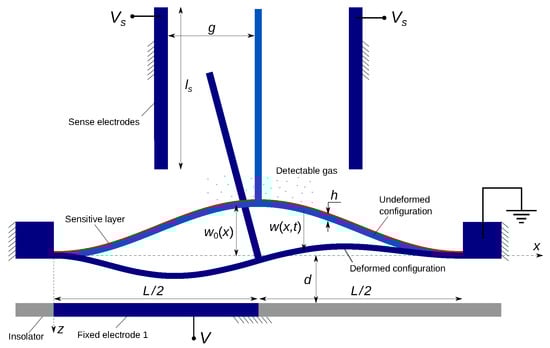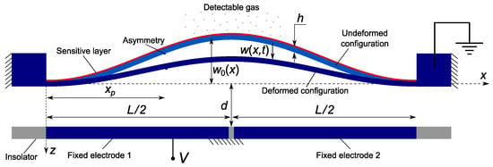 The gas sensor under study, Figure 1, is made of a clamped–clamped shallow arch of length l and width b, and thickness h. It is electrically actuated by a voltage drop applied between the beam and a side electrode. Different actuation configurations are considered to enable the activation of higher symmetric and anti-symmetric vibration modes. For instance, asymmetric actuation via electrode 1 or 2, so-called ‘half’ electrode configuration), enables the activation of the first anti-symmetric mode, whereas symmetric actuation via both electrodes would not be able to activate that mode. We note that the dynamic response of straight and arch microbeams under partial electrode actuation has been extensively studied in the literature [7,19,20,31,32,35,36]. Our objective is to demonstrate the exploitation of their dynamic features to develop novel and efficient detection gas mechanisms.