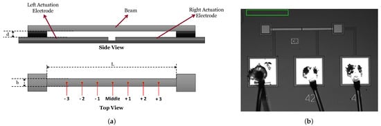 MEMS device under test: (a) side and top views showing the locations of the measurement points along the beam span, (b) a microscopic image.