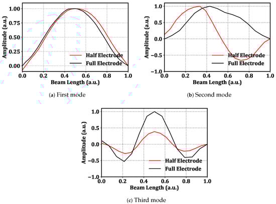 The first and third modes of the beam are symmetric, while the second mode is antisymmetric. Symmetric modes can be obtained by either half-electrode or full-electrode excitation; Figure 4a,c. However, Figure 4b shows that realizing an antisymmetric mode requires antisymmetric excitation. Therefore, under full-electrode excitation, the second mode cannot be directly excited, and the beam responds with first mode-like forced response, even when excited at the second mode’s natural frequency due to the fact that the excitation force has negligible projection on the second mode; Figure 4b.