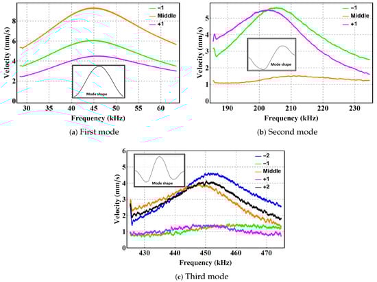 Figure 5 shows the frequency response in the vicinity of the natural frequency of the lowest three modes. The figure shows the RMS velocity at key positions along the beam under half-electrode excitation. The excitation frequency was swept from 25 kHz to 65 kHz, 185 kHz to 235 kHz, and 425 kHz to 475 kHz to capture those responses. Figure 5a shows that point −1 (green line) to the left of the mid-point moves 33% more than point +1 (magenta line) at the same distance to the right of the mid-point. Thus, the first mode is not perfectly symmetric due to the asymmetric nature of half-electrode actuation. The same can be observed in Figure 5c for the third mode.
