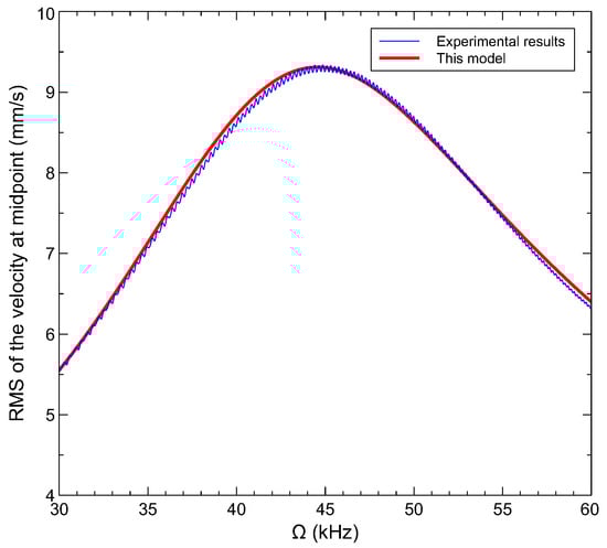 We swept the excitation frequency in the vicinity of each mode’s natural frequency, over a duration of 20 ms using the voltage waveform V and V. The velocity was captured in the time domain at the key points along the beam labeled in Figure 2. The captured time-domain data were post-processed to obtain the frequency response, the RMS velocity over a two-period time window, as the frequency of excitation was swept up.