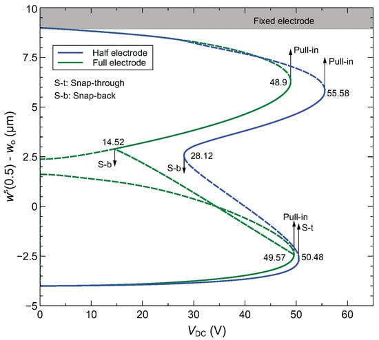 We first examine the static response of the arched microbeam for the full- and half-electrode actuation configurations. The formulation of the static reduced-order model using the differential quadrature method (DQM) is given in Appendix A. We show in Figure 7 the static response obtained at the midpoint for different applied DC voltages. These results demonstrate the significant qualitative and quantitative changes in the nonlinear static response when shifting from full-electrode to half-electrode actuation. In fact, only the lower stable branches obtained for low DC voltages and the higher unstable branches near touch down overlap. The bifurcation points leading to pull-in, snap-through and snap-back behaviors vary noticeably between the two actuation configurations. Furthermore, separate unstable branches are observed near the snap-back point of the full-electrode configuration while an unstable branch corresponding to an asymmetric response of the microbeam is only observed for this configuration [24]. The half-electrode design is highly asymmetric, which eliminates the occurrence of symmetry breaking bifurcation.