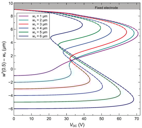 In the subsequent analysis, the focus will be on half-electrode actuation to exploit symmetry switching for sensing purposes. The initial rise of the arched microbeam constitutes an important design parameter. This can be controlled by applying a constant axial stress via an electrothermal process based on the Joule effect. In Figure 8, we plot the static response of the arched microbeam for varying initial rise. Both stable and unstable branches of the response are shown. It is noticed that the different bifurcation points are monotonically sweeping their positions with respect to the applied DC voltage such that the lower bifurcation point is shifting to higher voltage and the upper one is shifting to lower voltages. As a result, for high values of the initial rise (above 5 μm), the upper and lower bifurcation points correspond to snap-through and pull-in, respectively. As for lower values of initial rise, the upper bifurcation point corresponds to a pull-in point, and the lower one to a snap-through point. For all initial rises, the middle bifurcation point is the snap-back point.