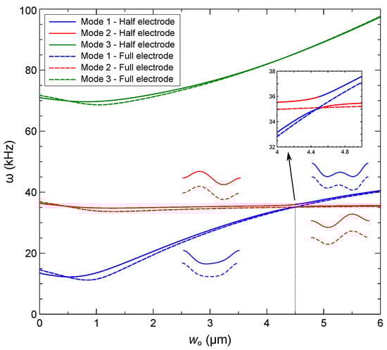 For comparison, we also show in Figure 9 the natural frequencies of the first three modes under full-electrode actuation with V. While the natural frequencies and mode shapes are similar to those of the half-electrode case, the symmetry of the electrical and mechanical domains result in crossing of modes 1 and 2 rather than the veering seen under asymmetry of the electrical field in the former case [41].