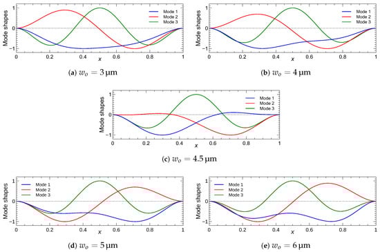 We used the model to investigate the interaction between the mode shapes around the veering point under half-electrode actuation. Figure 10, shows the first three mode shapes for five selected values of the initial rise under a DC voltage of V. We note that mode 1 and mode 2 refer to the first symmetric and first asymmetric modes, respectively. The shape of mode 2 remains unchanged except at the veering point, where the two modes are symmetric with respect to the mid span point. On the other hand, mode 1 hybridizes gradually with mode 2 as it approaches and crosses the veering point [31,41]. It is important to note here that the veering and the subsequent hybridization phenomena are occurring in a continuous manner with a smoothly increasing significance before the veering point, and then their effect decreases as the initial rise is further increased. In the present study, our main focus is on the half electrode design. We examine the strength of the interaction between the mode shapes, which is controlled by the initial rise of the arch beam. The shape of mode 3 remains unchanged throughout this process.