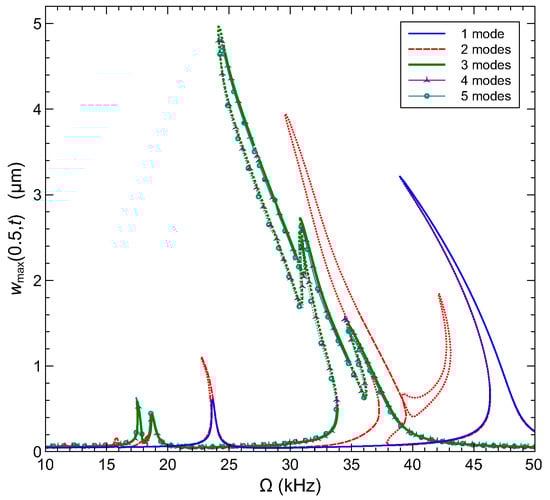 We first determine the number of modes required for the convergence of the dynamic solution. In Figure 11, we compare the frequency–response curves obtained using 1–5 mode Galerkin expansions for an arch microbeam with an initial rise of µm in the frequency range kHz. The curves describe the maximum deflection over the orbit of the mid-point with respect to a line connecting the supports . The microbeam is excited by a the voltage waveform with V. The RMS of this waveform is equivalent to V resulting in natural frequencies identical to those shown in Figure 9 and Table 4. Under these conditions, the natural frequencies of modes 1 and 2 appear in this range and are closely spaced. As a result, modal interactions between their primary resonances are expected. This behavior is recovered using three or more modes expansions as shown in Figure 11. The one and two mode expansions are qualitatively incorrect. On the other hand, the addition of the fourth and fifth modes does not seem to significantly improve the model accuracy. Therefore, we adopt a three-mode approximation for the rest of this paper. In this respect, the developed model is consistent with the literature on the required number of modes to achieve convergence [35].