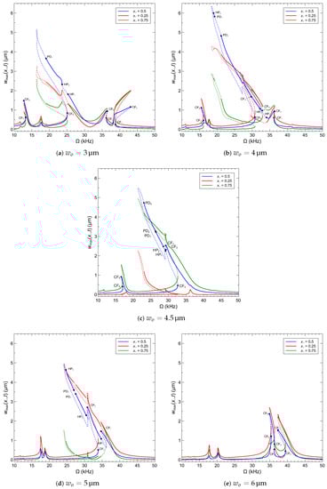 We show in Figure 12 the frequency response of the arch microbeam for five values of the initial rise. , 4, , 5 and 6 µm, under the voltage waveform V. The figures show the maximum displacement realized by the microbeams’s quarter-point , mid-point , and three quarters-point over the orbit. The stability of each orbit is determined by computing its Floquet multipliers. Stable orbits are marked by solid lines and unstable orbits are marked by dashed lines The location of and type of bifurcation are determined by observing changes in the number and/or stability of orbits available over the frequency spectrum. In all cases, the asymmetric actuation via the half-electrode results in excitation of both the symmetric and asymmetric modes (modes 1 and 2).