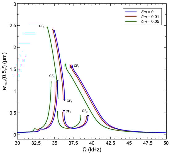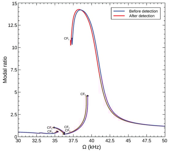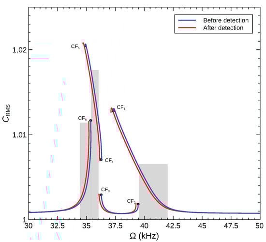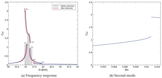 Bifurcation-based sensing mechanisms rely on a frequency shift a bifurcation point instead of a resonant peak and exploit the qualitative change in response beyond the bifurcation as a detector. We consider a sensor made of an arch microbeam with an initial rise of µm, where interactions between the modes are not active but mode 2 is hybridized. Inspecting the bifurcations identified in the sensor’s frequency–response curve, Figure 12e, we select two bifurcations, where the response jumps from a small stable orbit to a large stable orbit, namely CF2 and CF6, under a drop in the natural frequency, due to added mass, to implement the sensor. Those bifurcations provide for a reusable sensor since they avoid jumps to pull-in, and a large qualitative detection signal generated by a sudden expansion in the orbit size.