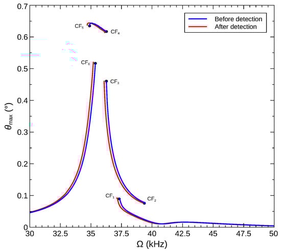 Figure 17 shows the maximum rotation angle of a rigid arm attached to the arch microbeam actuated with voltage waveform described in Section 5.2. Comparing the frequency–response curves before and after gas detection (addition of a mass of ) reveals that a sensor operating across the CF6 bifurcation will see a significant jump in rotational motions of the arm upon gas detection. On the other hand, a sensor operating across the CF2 bifurcation will see an undesirable drop in rotational motions.
