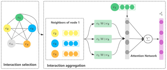 Among them, , , are the parameters of the model, and t represents the hidden layer size of the attention network. In order to make the attention coefficient easy to compare between different feature nodes, the attention coefficient is then obtained by the softmax function to . After the attention coefficients are obtained, the updated representation of the target node is obtained by calculating the nonlinear combination of these feature interactions: