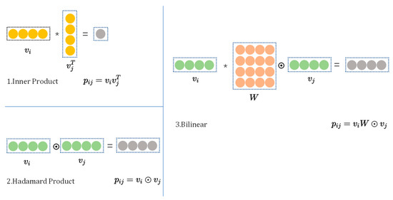 Bilinear interaction function. The classic methods of feature interaction are inner product and Hadamard product. Inner product is widely used in shallow models, such as FM [4] and FFM [5], while Hadamard product is often used in deep models, such as AFM [9] and NFM [11]. The forms of inner product and Hadamard product are expressed as and respectively, where , is the embedding vector of the i-th feature field, represents the inner product, represents the Hadamard product. For example, . However, inner product and Hadamard product are too simple to effectively model feature interactions in sparse datasets [40]. Therefore, this paper uses a more fine-grained method that combines inner product and Hadamard product to learn feature interactions with extra parameters. As shown in Figure 3, the inner product is used between the matrix and the vector , and the Hadamard product is used between the matrix and the vector . Taking the embedding vector of the i-th feature field and the embedding vector of the j-th feature field as examples, the calculation method of the feature interaction is as follows: