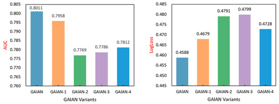 - The GAIAN model yields the best performance on both the Criteo and Avazu datasets and achieves innovative improvements over state-of-the-art models. On the Criteo and Avazu datasets, GAIAN has the highest AUC values (0.8011 and 0.7769) and the lowest LogLoss values (0.4588 and 0.3871). It is worth noting that a slightly higher AUC or a lower LogLoss at the 0.001 level is considered a significant improvement in the CTR prediction task, which has also been pointed out in existing work [21,22]. Due to the effectiveness of integrating graph structure and attention mechanism to model feature interactions, the proposed model has great advantages over the most advanced models.