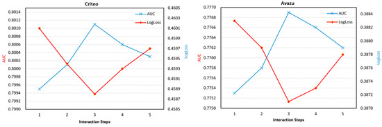 An appropriate number of iterations can effectively improve the predictive performance of the model. According to the experimental results, it can be observed that for the Criteo and Avazu datasets, when the number of iterations is set to 3, the model proposed in this paper can achieve the best performance. This is because the Criteo and Avazu datasets have 39 and 23 feature domains, respectively, and 3 iterative steps are sufficient to generate higher-order feature interactions.