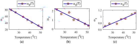 where is viscous friction at constant temperature case. Then, further parameterized viscous friction model parameters, Equation (15), were identified using the estimated parameters in Equation (19) for different joint temperatures (see Figure 4a–c). It should be noted that the temperature dependence of parameters of the velocity weakening function, , is neglected due to negligible variations with temperature change.