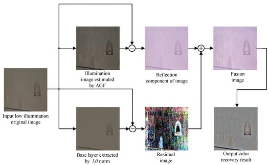 Although MSRCR performs better in image enhancement comparing MSR and SSR, the edge of the enhanced image is still inconspicuous, which makes the performance of MSRCR degrade in a dim environment. Accordingly, we propose an IMSRCR algorithm to solve the problem of fuzzy bolt edges in low-illumination tunnel images. Our algorithm uses Automatic Guide Filtering (AGF) to estimate the illumination image first and then calculate the reflected image according to the Retinex theory mentioned above. Residual image is extracted by the norm. Finally, the color restoration is carried out on the fused image. The flow path of our algorithm is shown in Figure 2.