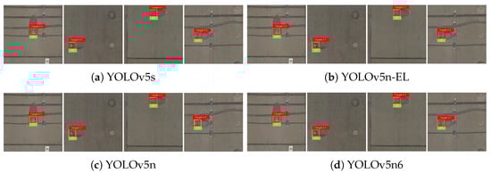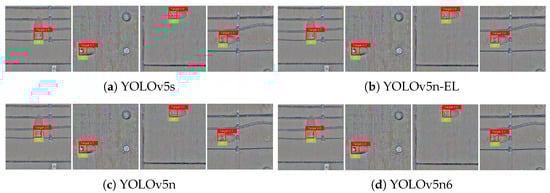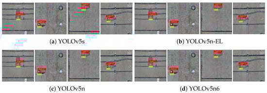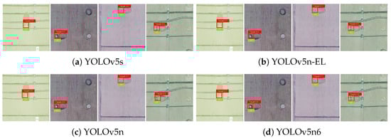 Figure 9, Figure 10, Figure 11 and Figure 12 show the visualization of some representative detection results in the test set. Compared to other YOLO detectors and the baseline YOLOv5n, YOLOv5n-EL offers better performance in detection like Figure 9b,c. Comparison between Figure 9, Figure 10 and Figure 11 shows that different color enhancement algorithms can heighten the significance of features, changing the effect of the total model.