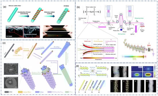 The third method introduces a coil structure to render non-stretchable conductive material a certain stretchability, like a spring. Park et al. demonstrated a stretchable triboelectric fiber using a sandwich structure with silicon-conductive yarns-silicon (Figure 5a) [87]. The conductive yarns were introduced by convolving around silicon rubber fiber. Then, another silicon rubber was coated on it as a shell for contacting. Gong et al. reported a continuous and scalable method for super-stretchable triboelectric yarn [88]. As shown in Figure 5b, stainless-steel yarn served as the conductive material. PDMS was melted and introduced with frozen compressed gas. Pretension was applied to the pulleys. Due to the difference in the rotational speed of the compaction roll and the take-up roll, the pre-stretched PDMS is released, driving the inner stainless-steel yarn into a helix structure. When the obtained yarn is stretched, the contact surface between the core yarn and the outer layer material decreases while the surface area of the outer layer material increases, thereby creating a potential difference. Alternating current can be produced via repeatedly stretching and releasing the SETEY.