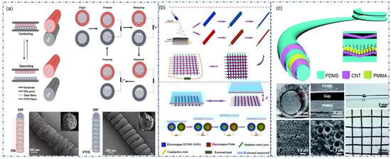 The second method integrates multiple triboelectric materials and electrodes on a single fiber. This type of CE fiber-TENG has a coaxial or core–shell structure. A gap is introduced between two different triboelectric materials to form contact to generate triboelectric charges, then connect the outer electrode to the inner electrode to form a circuit. Yu et al. demonstrated a complex coaxial triboelectric nanogenerator fiber (CTNF) with high performance [93]. As shown in Figure 6c, CTNF has a total of seven layers. First, PDMS fiber was applied as core fiber. Then, the CNT was coated on PDMS fiber as an inner conductive layer. PMMA microspheres and PDMS were deposited as triboelectric material. Sucrose particles were coated on PMMA as a sacrificial layer which will dissolve to generate an air gap between PMMA and PDMS layers. Another layer of CNT was coated on PDMS as an outer electrode. Finally, PDMS was deposited on top for protection of the conductive layer. All materials were coated on pre-stretched PDMS core fiber to obtain stretch properties. The dissolved sucrose created a ~10 μm space for contacting and separating the PDMS and PMMA layer, generating ~2 V as Voc and 200 nA as Isc when the length of CTNF is 2.5 cm, and the pressing force is 10 N. He et al. utilized copper wire convolved with silicone rubber to produce highly stretchable CS-TENG. Conductive ink made of CNT and polymer was coated on silicone rubber as an inner electrode, followed by another coating layer of silicone rubber. Copper microwire was convolved on the fiber as the outer electrode as well as the outer friction material. The copper coil will contact and separate with silicone rubber during stretching.