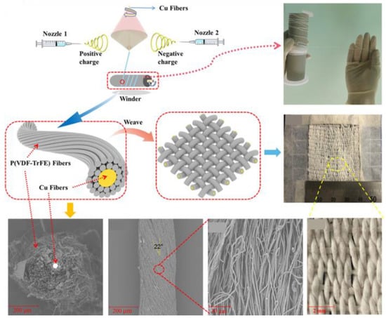 Due to the limitation of contact area, single fiber-TENG is challenging to realize the purpose of TENG as an energy source. Fabrication of fiber-TENG can not only improve the surface area and triboelectric performance, but also maintain good wearability. However, the large-scale production of triboelectric yarns is the core issue. The complex structure, various materials, and different processing of triboelectric yarn are the main problem when considering large-scale production. A few strategies for scalable triboelectric yarns are listed. As mentioned above, spinning has been proven as a robust method for scalable production of fiber/yarn-TENG. Traditional textile materials have excellent properties and are easy to apply. At the same time, fiber/yarn TENG produced by spinning can be better used for subsequent fabrication. They can be directly used in existing textile machines, such as weaving, knitting, sewing, and other equipment. Braiding is a good candidate for the fabrication of fiber/yarn-TENG. It allowed triboelectric fiber to be directly warped on a conductive thread to make yarn-TENG. As mentioned in the last section, the production or coating of a hollow silicone tube with the injection of conductive material can also be designed as scalable production. A modified electrospinning method was reported for scalable production of nanofibrous yarn for wearable smart textile (Figure 7) [94]. It is a one-step method based on electrospinning which involves a pair of positive and negative power supplies. The prepared polymer solution was put in different nozzles connected to the positive and negative power supplies. Under the action of electrostatic force, nanofibers are spun out and form a spinning triangle above the drum. The collector was rotated, and the spun fibers were twisted in the spinning triangle around the metal core.