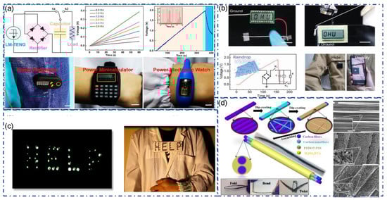 The daily motion of the human body produces a significant quantity of mechanical energy, which can be captured and transformed into electrical energy via TENG. As an integral part of daily life, textiles are very suitable as carriers for TENG [53,54]. Textile-TENG is a vital part of a self-charging smart textile system that utilizes the triboelectric effect to continuously power the electronic components in the system [55]. In addition, TENG can be designed as wearable electronic components, such as a self-powered system for sensing or a human–machine interface integrated into smart textile systems [56].