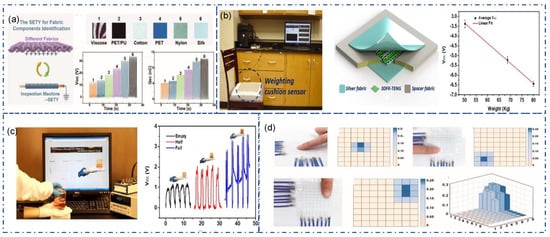 Unlike traditional sensors, TENG can output signals without an external power supply, rendering its high potential as a self-power sensor. The signal output of TENG is affected by force, frequency, deformation, and environmental factors and can be used for healthcare monitoring, human motion detection, and human–machine interaction. Both fiber-TENG and fabric-TENG can be used in sensing system design. The properties of SE mode TENG influenced by foreign materials make it worthwhile for material identification. For example, the triboelectric affinity of different textiles is different, so Textile-TENG can “recognize” it. As shown in Figure 10a, when contact with different fabrics such as cotton, silk, polyester, and nylon, the open circuit voltage produced by Textile-TENG is significantly different [80]. The high sensitivity of applying force renders it great potential as a stress sensor. As shown in Figure 10b, a weighting cushion sensor was demonstrated, with high accuracy for measuring the occupant’s weight [95]. In addition, a fully textile stress sensor successfully detects the weight of liquid in the bottom (Figure 10c) [95]. By connecting each yarn-TENG individually, a sensing fabric was prepared. It can track or record the action of the finger or external force at each point of the fabric (Figure 10d) [80].