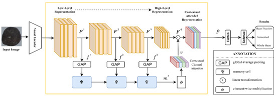 Assume that and correspond to high-level representation and contextual channel attention on the jth channel, respectively. For determining the category, the contextual attended representation involves low-level visual representations with fine-grained information and is input to the following linear transformation.