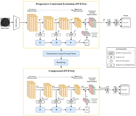 As depicted in Figure 3, the PCENet model, as presented in [1], is further compressed by pruning filters. Furthermore, we retrain the model after the compressing technique is performed. Eventually, a light model is constructed and could be further assessed and deployed into the edge platform. In this study, we assessed the cocoa bean images.